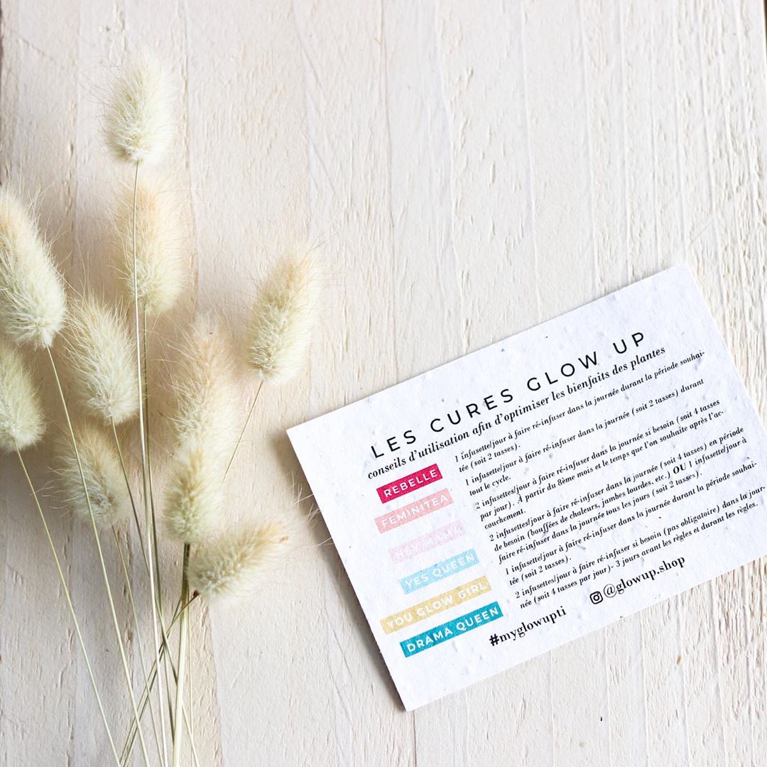 Nous avons choisi @growingpaper_france pour réaliser les petits cartons qui accompagnent vos commandes. Faits en papier ensemencé, vous n’aurez qu’à le planter, une fois lu, pour voir apparaître une jolie fleur après quelques semaines?. Au dos de cette carte vous trouverez les conseils d’utilisation pour chacune des cures, afin d’optimiser les bienfaits des plantes?.